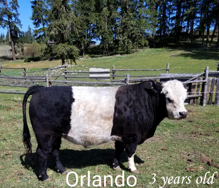 Orlando is our short, thick , compact, muscled , Double Registered : Panda and 43.75 percentage, Lowline Belted! He is Oreo's son and he is the Herd Sire of our 2020 /2021 calves! Orlando is kind, Respectful, and so handsome! Orlando is around 45 inches to the top of the hip and weighs around 1200 lbs.